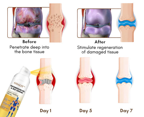 ODALIT⢠Magnesium Oil & Bee Venom Joint Healing Spray is a fast-absorbing, non-greasy formula crafted to relieve joint pain naturally and effectively. Enriched with therapeutic-grade magnesium oil to support bone health and potent bee venom to reduce inflammation, ODALIT⢠penetrates deep to ease swelling, restore flexibility, and improve joint functionâwithout sticky residue or harsh chemicals.